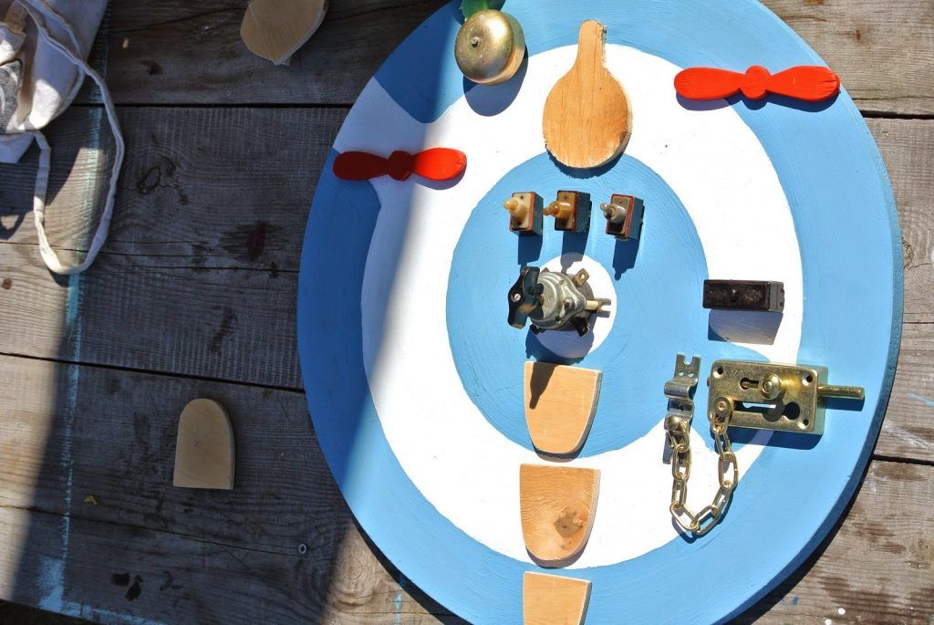 By the way, that’s what my first baby activity toy – “Control Panel Busy Board” – looks like after a year of heavy use: