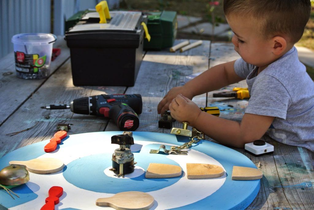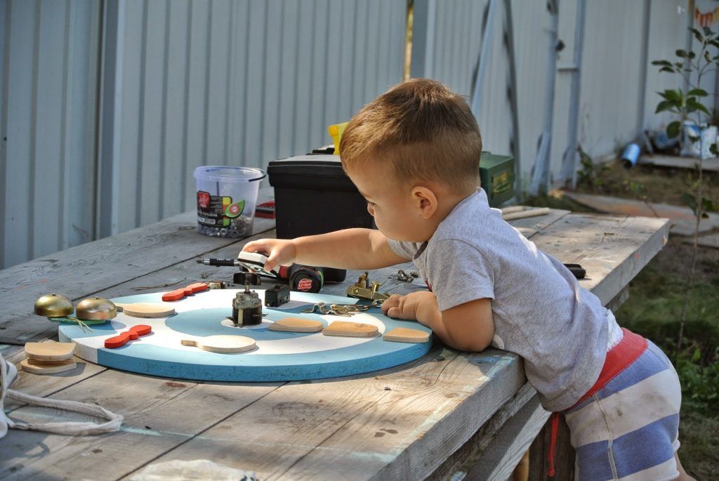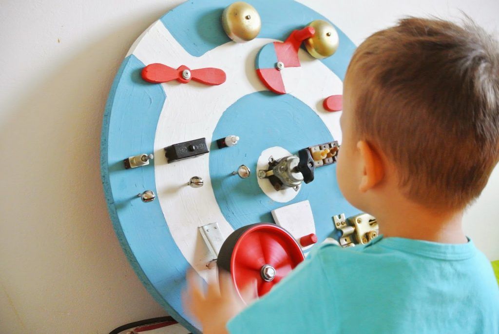 Busyboard provides a combination of hardware pieces and puzzles that gives an active toddler a safe, yet realistic skill-building play area.